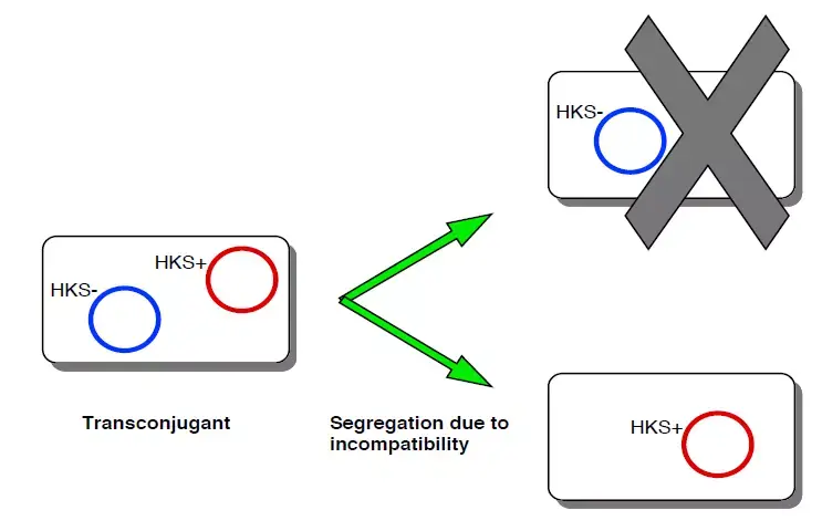 质粒一旦寄存于细胞,就很难被摆脱。高复制质粒(Multicopy plasmids)一般可以利用自己在细胞内的高拷贝数通过数量取胜。举个例子,假如有一个复制数为40质粒(也就是在一个细胞里有40个一模一样的质粒),在每一次分裂中每个质粒出现在其中一个子细胞里的概率是1/2,那么理论上分裂后其中一个子细胞一个质粒都没有的概率是多少呢?0.5的39次方:大约是五千亿分之一。也就是说,在细胞分裂时,每个子细胞都有极大可能会或多或少地带有原来细胞的质粒。