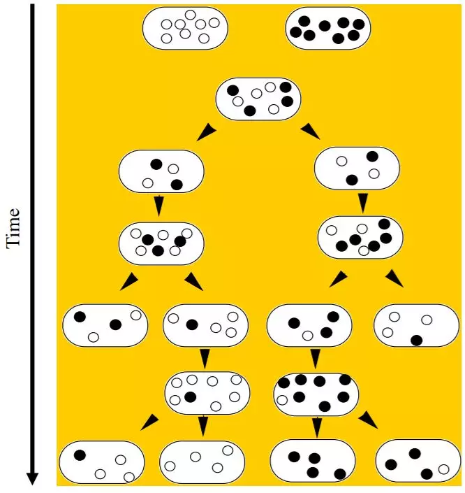 这种负反馈机制造就了质粒间的同类相残。如果两种质粒使用的负反馈机制不同,它们就会井水不犯河水,和谐共处;相反,如果它们使用的是同一套负反馈系统,它们就会互相压制。这种同类相残的现象被称为质粒不相容性:如果将不相容的质粒转入同一个细胞中,一段时间过后,也许在这个种群中两种质粒都存在,在每一个细胞中也都只能看到一种质粒。