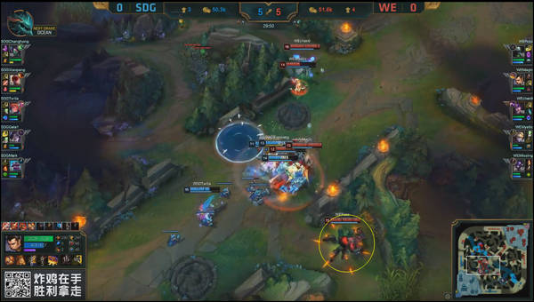 WE从14分钟下路劣势开始,他们比SDG更早的推掉中路一塔,更早的推掉中路二塔。这才让WE有了一次又一次的中路强开团与野区入侵。战线越长,SDG的破绽越多,比如29分钟这波例子,WE上单厄加特的切入位置,一旦他斩杀残血,SDG团战会瞬间被击溃。