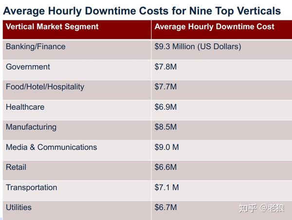 关键业务服务器对可靠性要求非常严格,调研机构曾调查过不同行业,关键业务中断服务带来的金钱损失:服务器宕机1分钟,平均会使运输业损失15万美元,银行业损失27万美元,通信业损失35万美元,制造业损失42万美元,证券业损失45万美元。而根据ITIC最新2018年底统计,1小时停机损失: