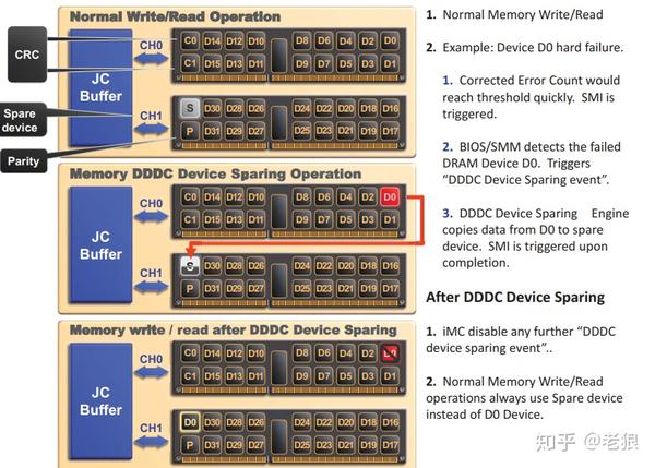 这个冗余度和RAID1一样是很大的,一半的资源在大部分情况下闲置了,在提高可靠性的同时浪费也十分严重,有没有稍微省钱点的做法呢?当然有,那就是内存备用(Memory Sparing),简单来说就是保留了部分内存,当出错再把这些内存拿来顶上。它的颗粒度可以到DIMM甚至以Rank为单位。