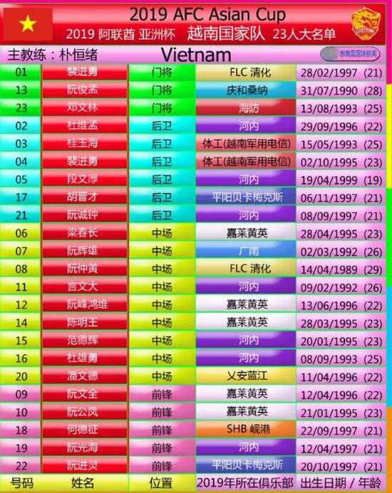 除了名单上的新锐,越南队还有很多优秀球员因伤缺席了亚洲杯。比如武文清,范春孟两大边翼卫。其中范春孟是乂安蓝江青训出品,现在效力乂安蓝江;武文清是嘉 莱黄英青训出品,同样现在效力嘉莱黄英,他们的边路突然能力出众,防守意识强。而且他们二人都是U23亚洲杯以及亚运会越南队的绝对主力球员。