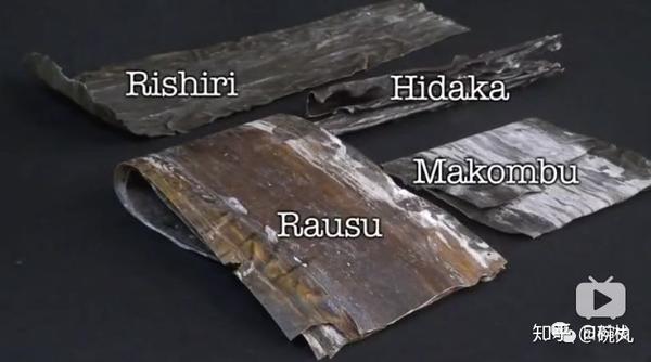 四大昆布:利尻昆布【左上】、日高昆布【右上】、罗臼昆布【中】、真昆布【右下】。via:龙吟料理视频