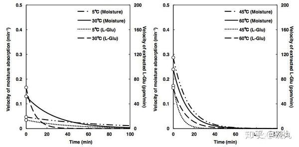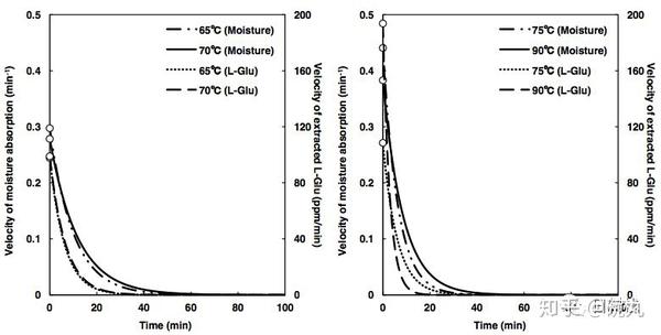 三木阳平的论文《布だし抽出における旨味・雑味成分の拡散挙動》中对加热昆布汤的温度与谷氨酸析出速度的研究。via:http://oacis.repo.nii.ac.jp