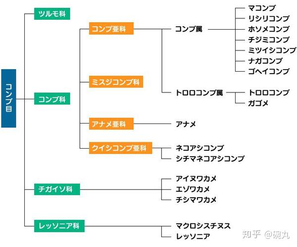 日语中的昆布指海带科(图中橙色部分)的多个物种。via:http://konbukan.co.jp