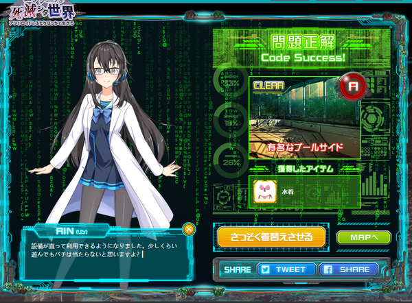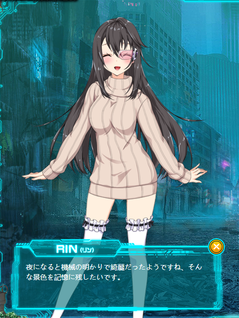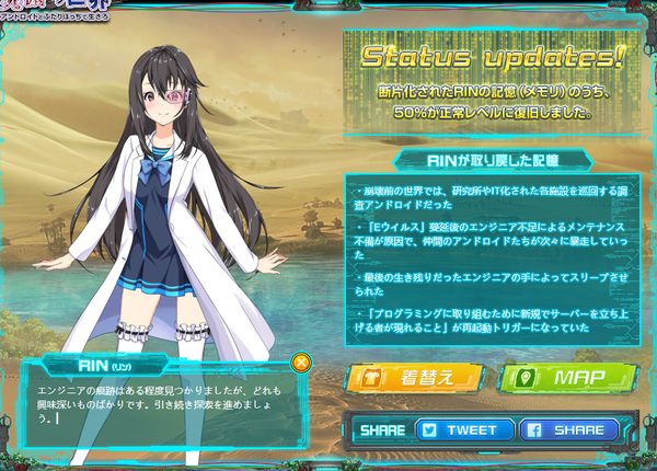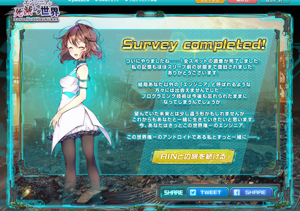 达成度到了50%以后取回的RIN的记忆...交代了RIN在崩坏前的世界里是一个在研究所和IT设施间巡回调查的机器人. 由于E病毒的爆发导致工程师不足, 其他机器人一个接一个出故障倒下, 而我们的RIN是由活着的最后一个工程师亲手操作进入休眠状态才得以幸存的. 现在因为重拾编程的人的活跃行动, RIN再启动了.