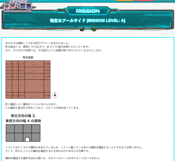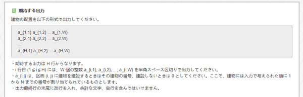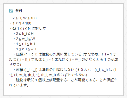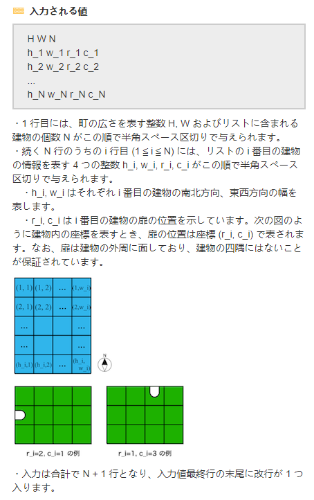 其中H为城镇的南北纵长, W为城镇的东西横长. N为可供放置的建筑物的数目.