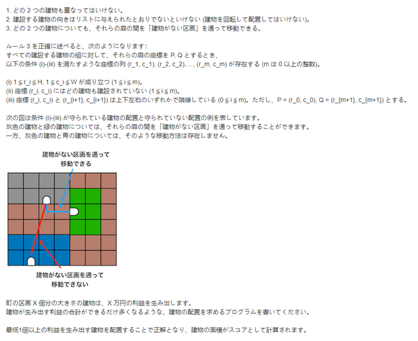 只需给出正确放置了至少一个建筑物的方案即可被视为正解. 建筑物的总面积将计为得分.