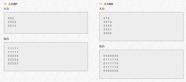 · 输出一个有H行, 每行包含W个由半角空格字符隔开的整数的点阵.