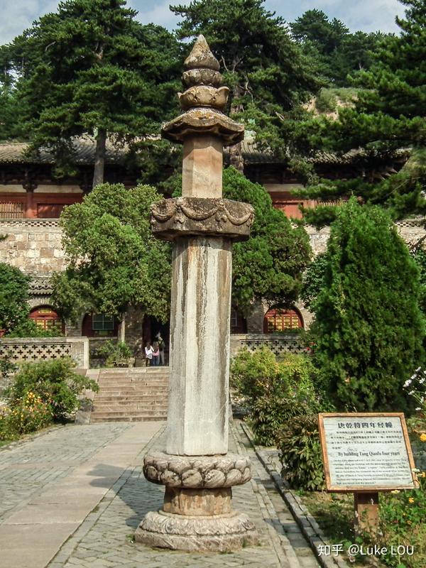 佛光寺的山门建于清代,已是整个建筑群中极为年轻的一座。而进入山门之后,位于庭院中央的是一座建于乾符四年(877年)的唐代经幢,高约4.9米,上刻有《佛顶尊胜陀罗尼经》,是唐代最流行的经幢内容。另外,在东大殿外的平台上还保留了另一尊唐代经幢,高3.24米,上刻有《陀罗尼咒》。这尊经幢上的落款可以比对东大殿内的梁上题记"女弟子宁公遇",东大殿的建筑年代最终在这里得到确认。