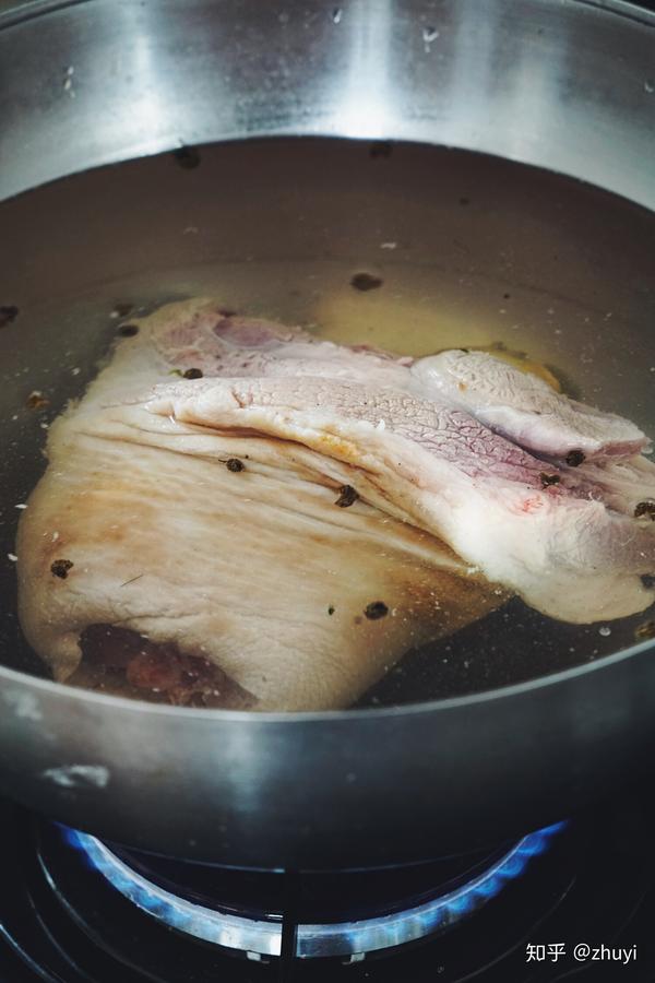 接下来,要有一大锅水,蹄髈稍作清洗,冷水入锅,加入生姜、花椒、料酒,煮到沸,会有很多浮沫出来,没关系,整锅水都不要,这样蹄髈基本就算清理干净了。