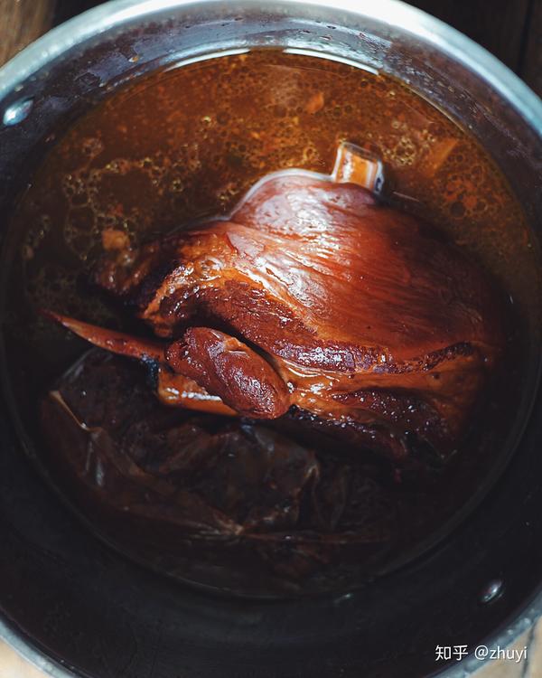 整个煨煮过程,至少需要2小时,这时的蹄髈已经可以吃了,但是香味可能不足。如果3-4小时,甚至以上,可能会达到最酥软的状态,用手轻轻推一下蹄髈的棒骨,能感觉到骨肉好像多用点力可以分离了,这时候就不要再煨煮,而且装盘翻面都需要很小心。