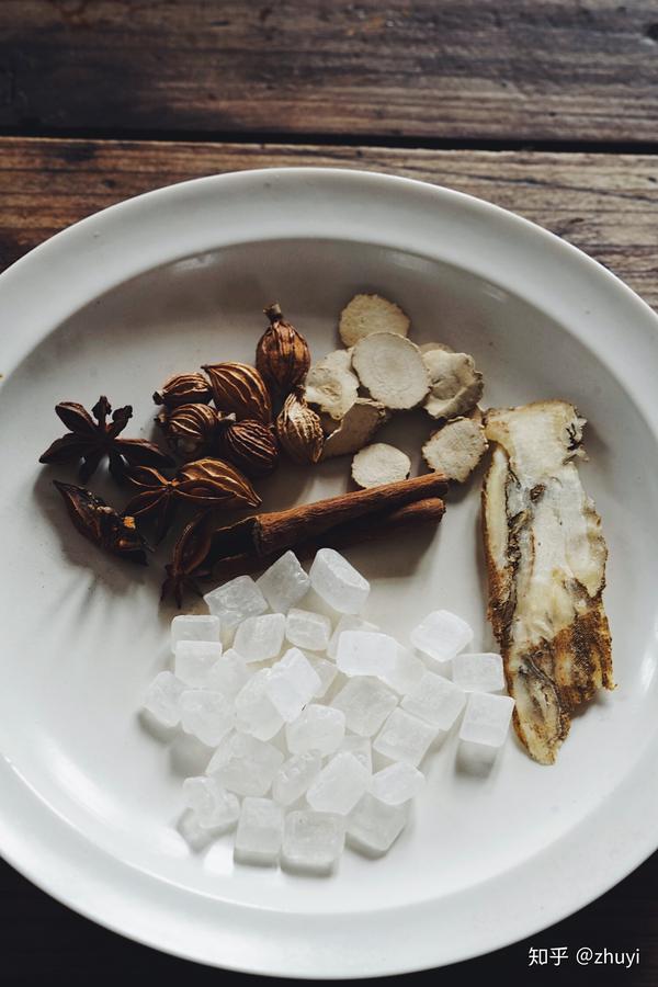 总之红曲米是一种很安全可靠的上色食材,本身也没什么特别味道。其他调味材料如下:八角、桂皮、砂仁、白芷、当归。后三样没有也无妨,这个是个人喜好,我喜欢回味有药香的调味,更加化解油腻感。