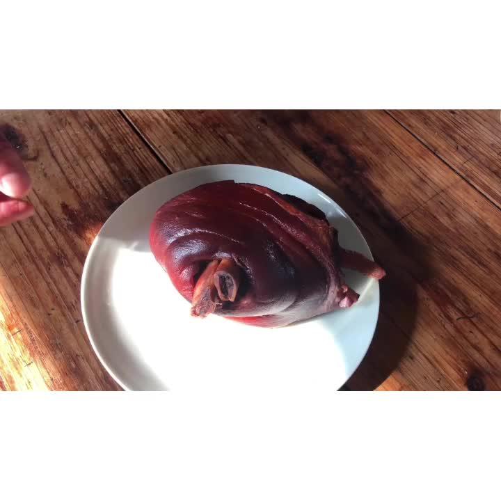 但大家筷子雨点般落下的时候会把猪蹄髈搞得乱糟糟,卖相分分钟丢人。所以,这个整只蹄髈展示完,我建议你还是切片、切块再分享给大家。