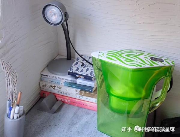 长条形的书桌上,为来客准备了Brita滤水壶、手冲咖啡、笔筒,还有纸等文具。