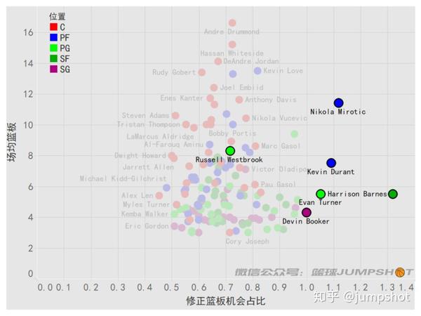篮球不中弹起的一刻,谁离篮板最近,谁就最有可能摘下此篮板,此则为Reb Chance,某种程度上可表征球员对篮板落位的预判。理论上来说,Reb Chance是必然大于等于Reb的,那么在同等Reb Chance下,抓的篮板越多,对篮板的把握就越大,此处官网用Reb Chance Percent(RCP)来衡量,RCP = Reb / Reb Chance。