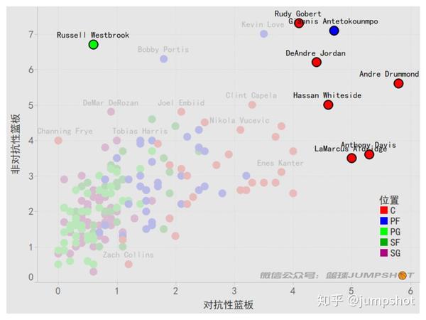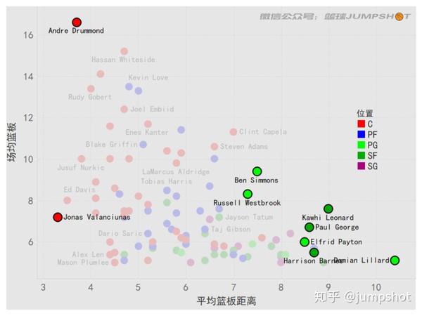 在场均篮板大于5个的球员里,利拉德最擅长抢长篮板,平均篮板距离已超过10英尺(3米,大概在罚球线和篮圈连线的中点位置),巴恩斯、小卡、泡椒、小佩顿也都是好手,而另一端,瓦兰修纳斯、庄神等人的平均篮板距离则只有1米(底线到篮圈的距离是1.2m)。
