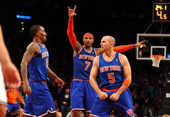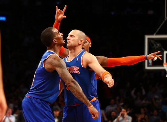 而就在这个时候,杰森-基德作为第二个改变安东尼命运的后卫来到他身边。在他和伍德森的帮助下,2012-13赛季的尼克斯成了联盟中最让人惊喜的球队:这支NBA历史上平均年龄最大的球队用大范围转移球和在当时创历史的三分给安东尼提供了可能的是他生涯里最好的输出环境,而作为战术支点的安东尼也用生涯唯一一个得分王的表现回应了这种支持——赛季末期那一波13连胜让尼克斯爬到东部第二,季后赛首轮,他们险些用一次横扫终结了绿军的玄冥二老时代,整个过程中,安东尼表现的就像是08年以后的诺维茨基,不断迎难而上用最古典的方式不断破防取分,带队前行。