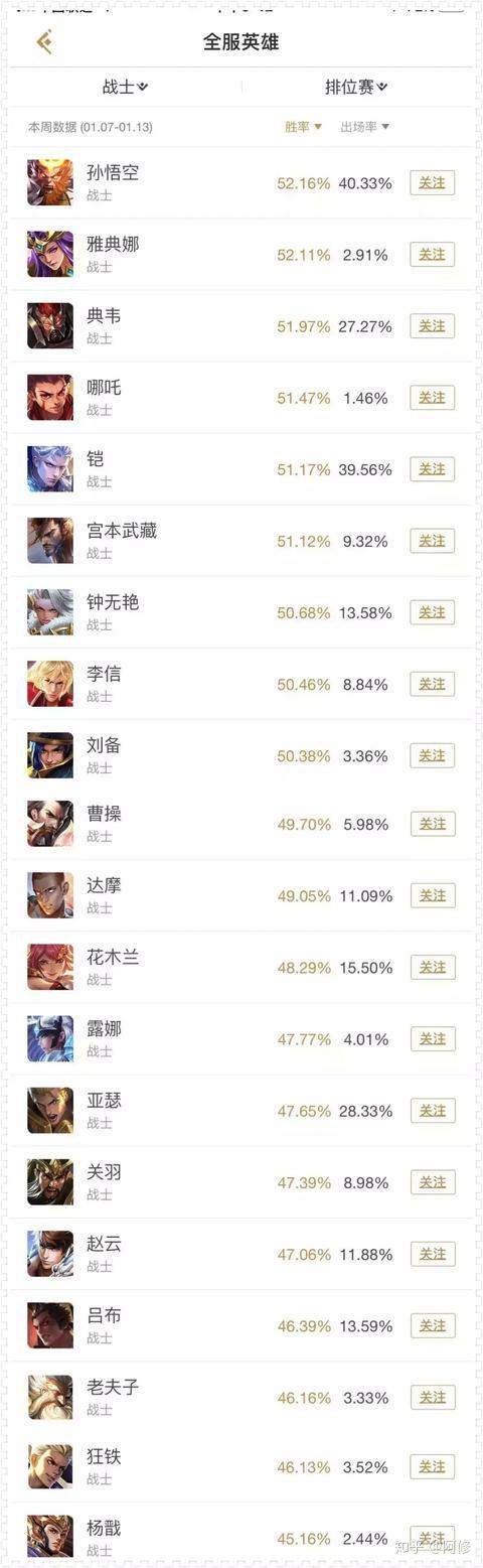 战士这里,孙悟空和雅典娜的胜率就不用看了,这个两个英雄多是走打野位置,而雅典娜则可以打边路还可以打献祭流辅助,这里不多提及。